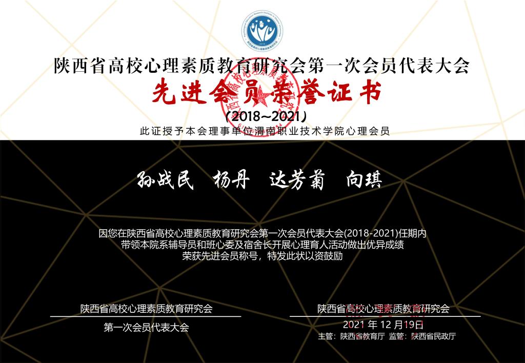 近日,省高校心理素质教育研究会对理事单位心理育人工作成就进行了表彰,必赢官网达芳菊教授、向琪副教授两位老师荣获“先进会员”荣誉称号。向琪老师还荣获“2021年度陕西省高校十佳心理师提名”荣誉称号。