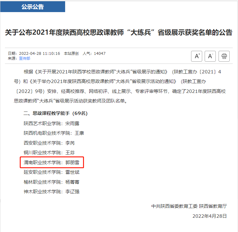 4月28日上午,陕西省委教育工委、省教育厅联合公布了《关于2021年陕西高校思政课教师‘大练兵’省级展示获奖名单的公告》,必赢官网必赢国际437官网青年骨干教师郭朋雪获思政课程教学能手荣誉称号。