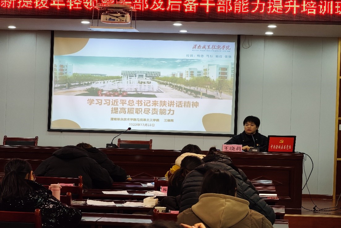 2月13日、14日,必赢官网必赢国际437官网院长王晓莉分别为澄城县新提拔年轻领导干部及后备干部能力提升培训班学员和渭南市经开区管委会干部职工学习习近平总书记来陕考察重要讲话重要指示精神进行专题辅导。